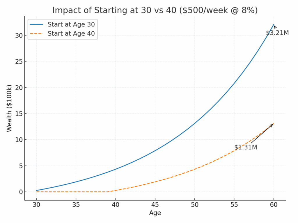 Compounding works like gravity. The longer it pulls, the stronger it gets. Start in your 30s, and you have decades of runway. Leave it until your 40s or 50s, and you’ll need to sprint with risk just to catch up (don’t do that).