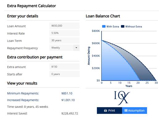 You can calculate your own personal extra home loan repayments using my Extra Repayment Calculator.
